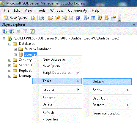 2. Expand Database – klik kanan OtomaX – pilih Task – pilih Detach